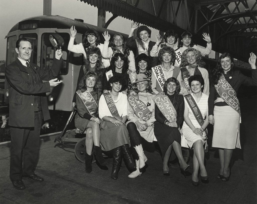 | This is a photograph of the regional Coal Queens posing at a railway station for the National Coal Queen final at Blackpool in 1982. |