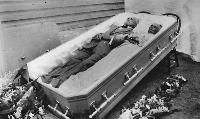 | Thomas Jefferson Souder laying in a casket next to his wife, Mary Ellen Souder. They died three days apart in July, 1921. Jefferson was 80. Mary was 78. |
