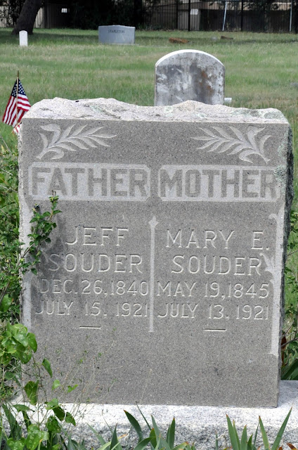Thomas Jefferson Souder and his wife Mary Ellen buried together in a custom double casket. They were married 60 years, and died a couple of days apart in July, 1921 – Mary on the 13th, Jeff on the 15th.