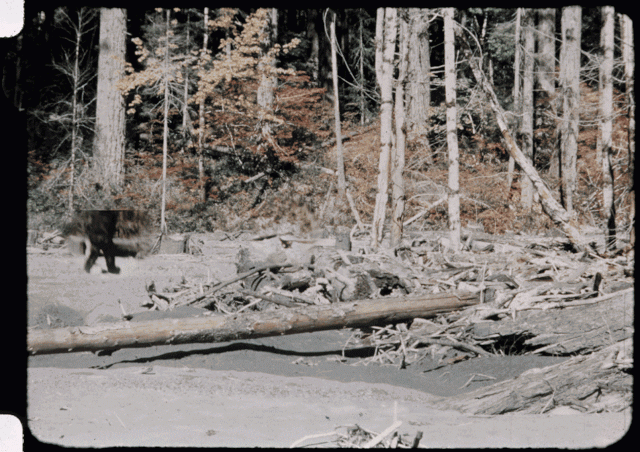 Shortly after this point the steady, middle portion of the film begins, containing the famous look-back frame 352. Patterson said, “it turned a total of I think three times,” the other times therefore being before the filming began and/or while he was running with his finger off the trigger. Shortly after glancing over its shoulder on film, the creature disappeared behind a grove of trees for 14 seconds, then reappeared in the film’s final 15 seconds after Patterson moved ten feet to a better vantage point, fading into the trees again and being lost to view at a distance of 265 feet as the reel of film ran out.