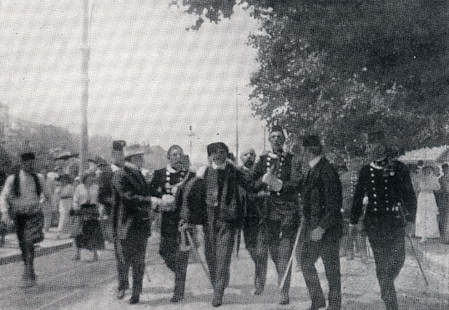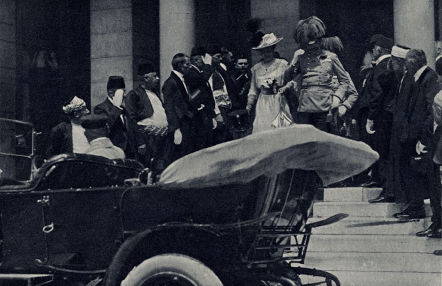 The Archduke and his wife emerging from the Sarajevo Town Hall to board their car on the morning the were killed.