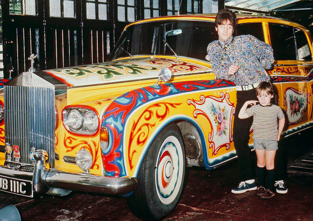 The car needed a new paint job after Lennon used it in Spain during his filming in Richard Lester’s How I Won the War. Lennon commissioned a custom paint job from private coach makers J.P. Fallon Ltd. in the style of a Romany gypsy wagon. Artist Steve Weaver painted the red, orange, green and blue swirls, floral side panels and a Libra on the roof. Lennon was in a 60s mood and wanted to make a statement to the English establishment. He loved telling a story about an elderly woman who hit the car with her umbrella.