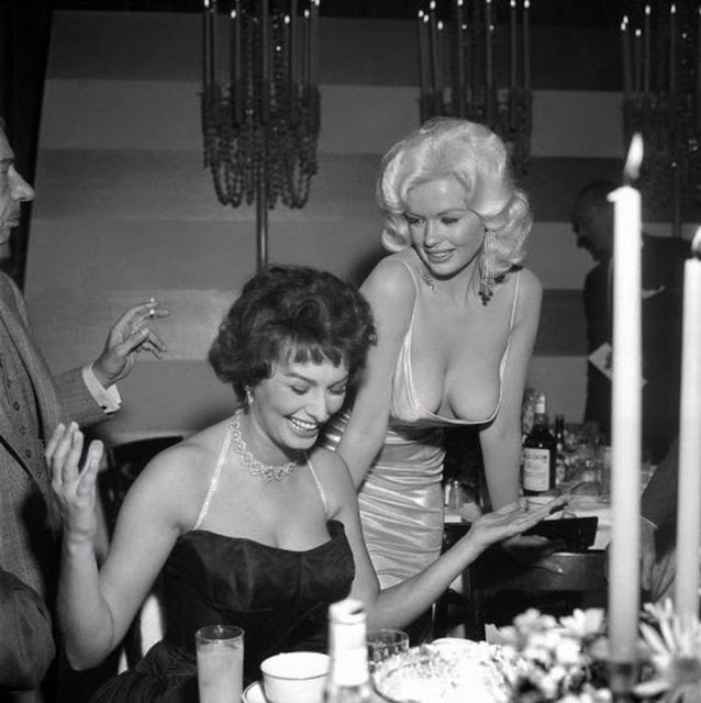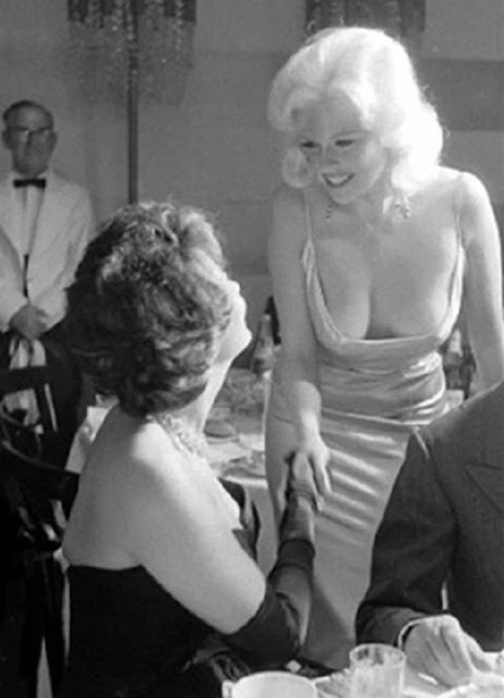 Mansfield sat down at Loren’s table which included actor Clifton Webb and of course, had every eye in the room watching her. She barely dressed for this event and her famous ample breasts were the focus of a notorious publicity stunt intended to take the media attention away from newcomer Loren. Loren couldn’t help but stare at her exposed nipple, as she was fearful that they would come down crashing down on her plate!