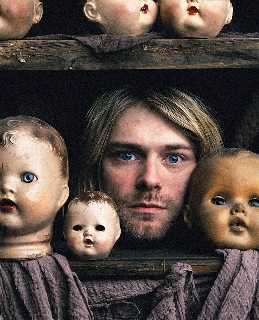 This image of Kurt Cobain is from a session that was taken about in October 1993, six months before he passed. It was for an article in Rolling Stone about the making of In Utero. This particular image feels more or less like a portrait but in a still life situation, with these antiquated doll heads on a shelf behind this cascading wall of red roses.