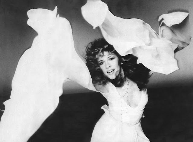 Stevie Nicks from Fleetwood Mac stands in the ocean breeze with her trademark flowy dress sleeves rippling dramatically over her head. The photographs were taken by Neal Preston on the roof of Stevie’s condo in Venice Beach, CA during a shoot for People Magazine.