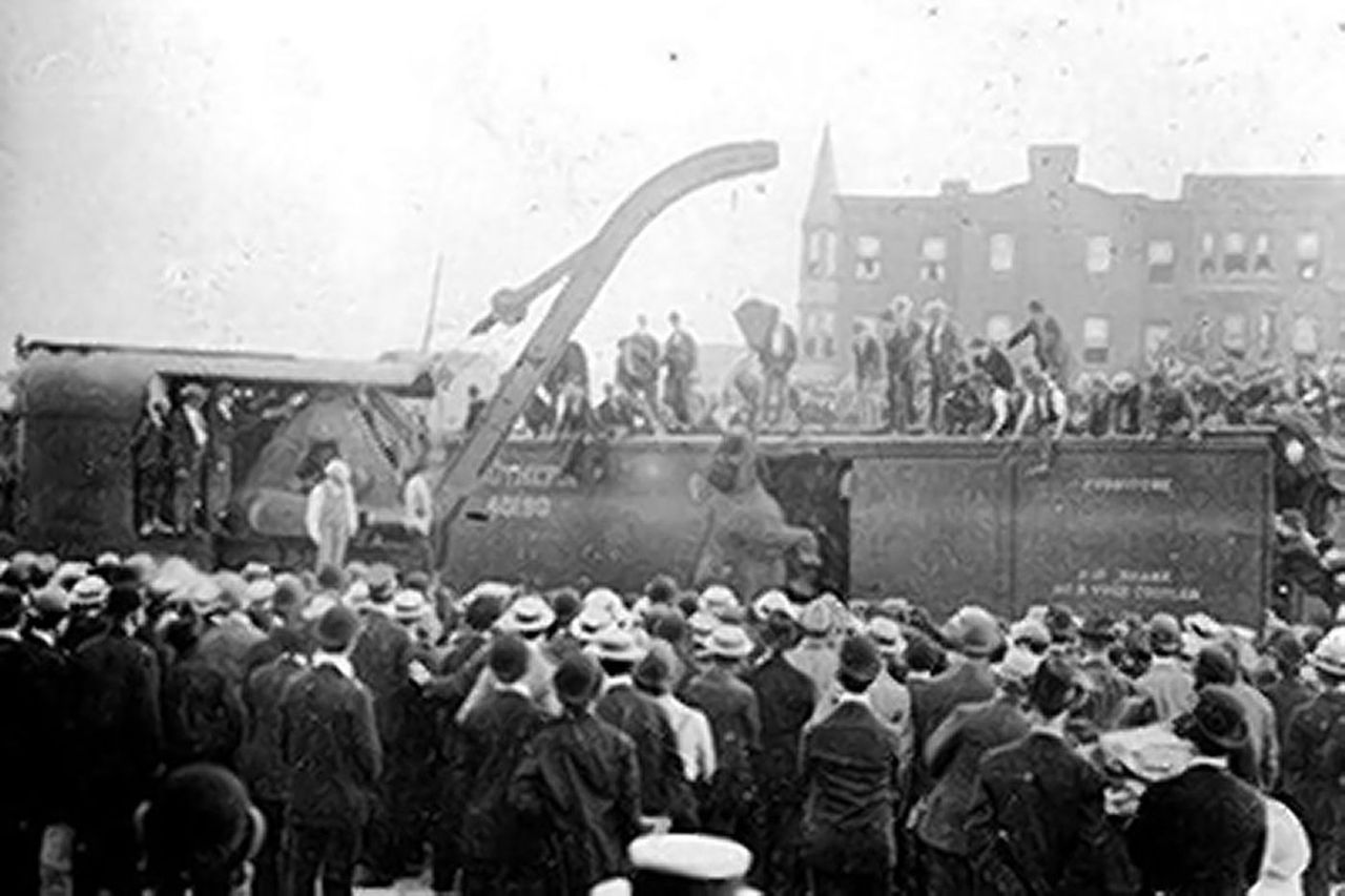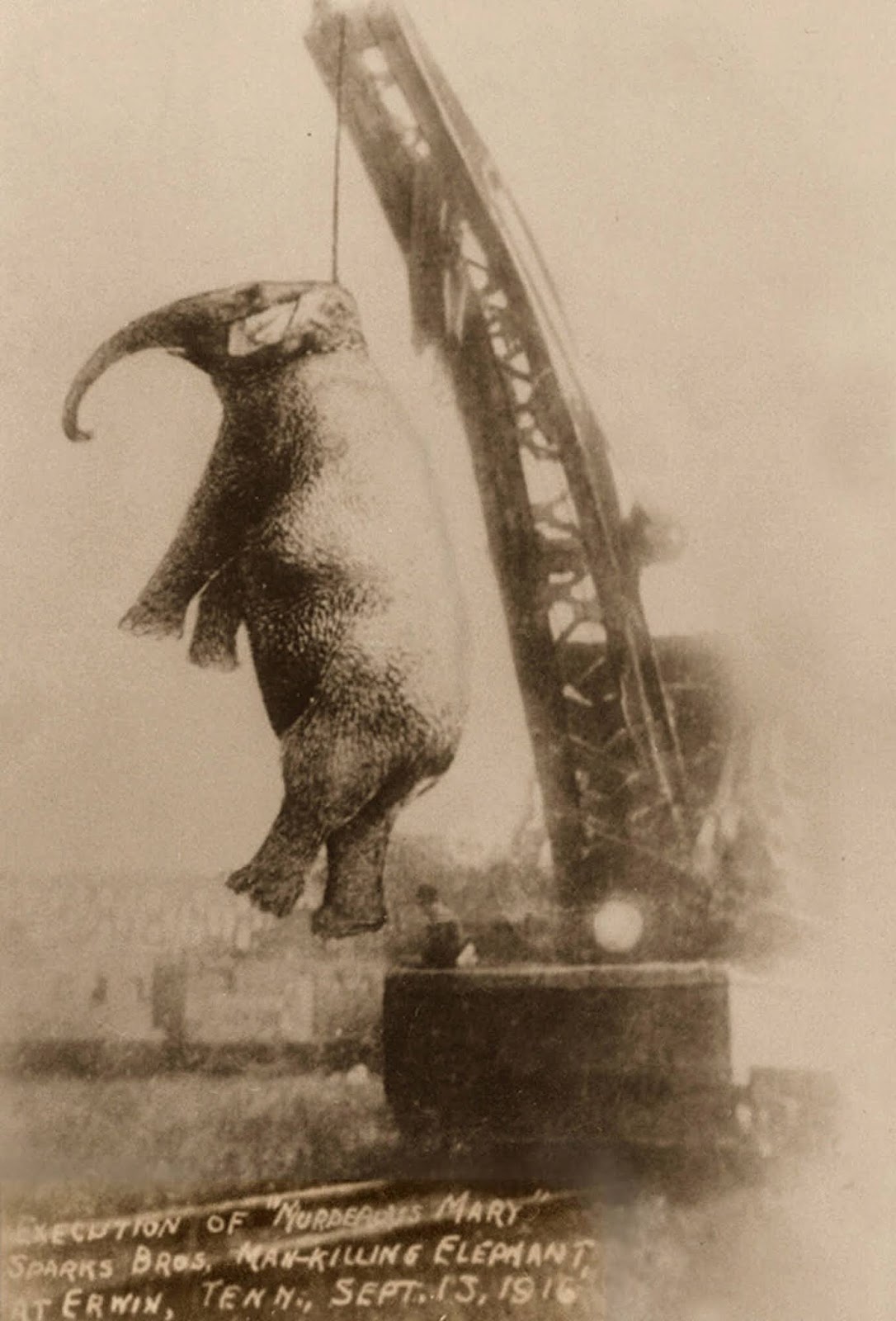 This photo was taken on September 13, 1916, shortly after a circus elephant named Mary was hanged in Erwin, Tennessee. The animal had killed a circus worker the day before in nearby Kingsport. This picture is believed to be the only one in existence documenting the elephant’s execution. Experts say the picture, which may have been touched up years ago, appears fuzzy because it was taken in late afternoon in the rain.