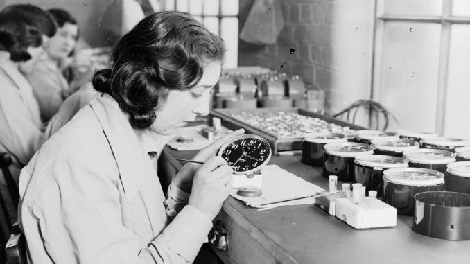 Wikimedia CommonsWomen painting alarm clock faces in the Ingersoll factory. January 1932.