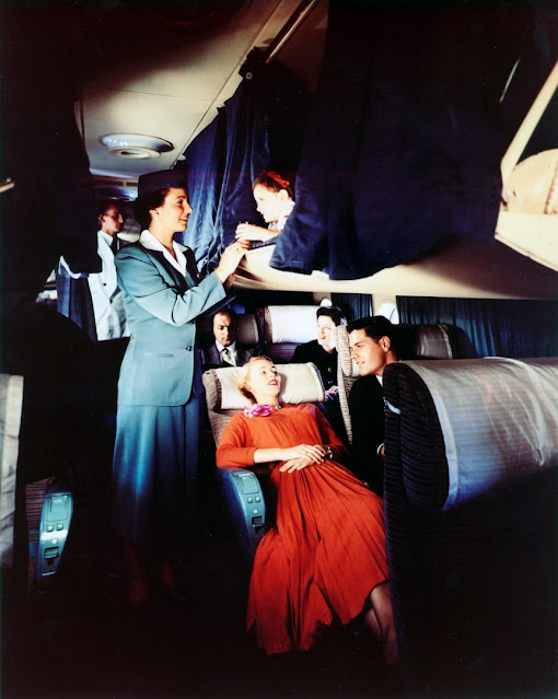 Flight attendants served meals on china plates, passengers relaxed in lounges on the plane, and most seats turned into sleeping berths – these vintage photographs below show how glamorous flying was in the 1950s: