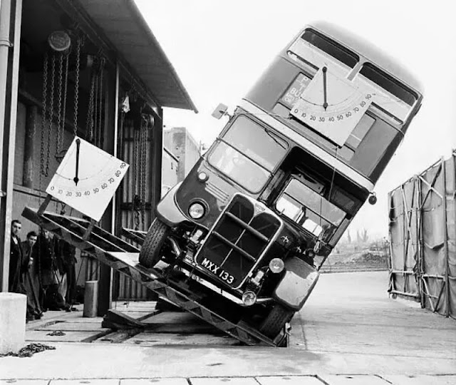 In the United Kingdom, double-decker buses have to be capable of leaning, fully laden on top, at an angle of 28 deg without toppling over before they are allowed on the road.