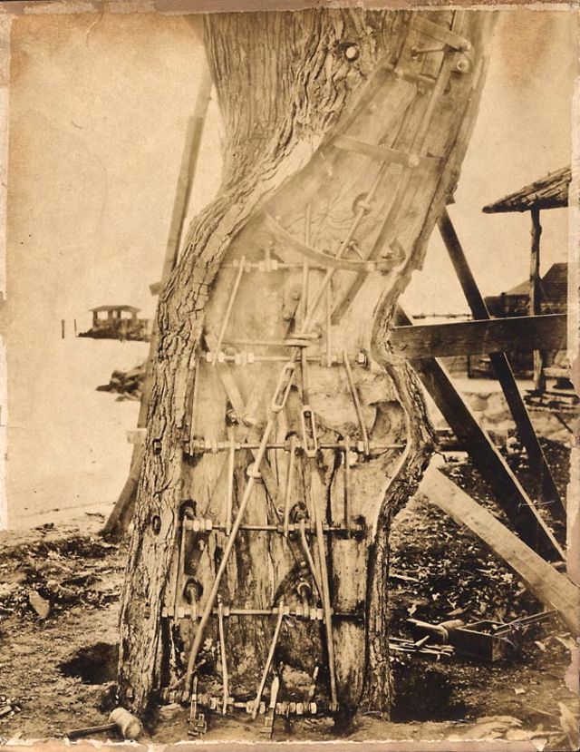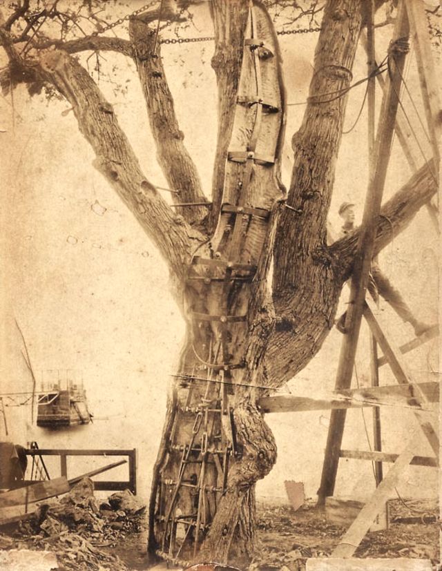 Founded in 1880 in Kent, Ohio, by John Davey, Davey Tree Care Co. was a company that offered to the wealthy landowners in the area to look after their rare tree specimens. These photographs were taken in 1890 to show the techniques used to model the shape of a tree by splitting it and forcing each branch into a predefined position.
