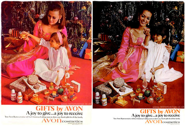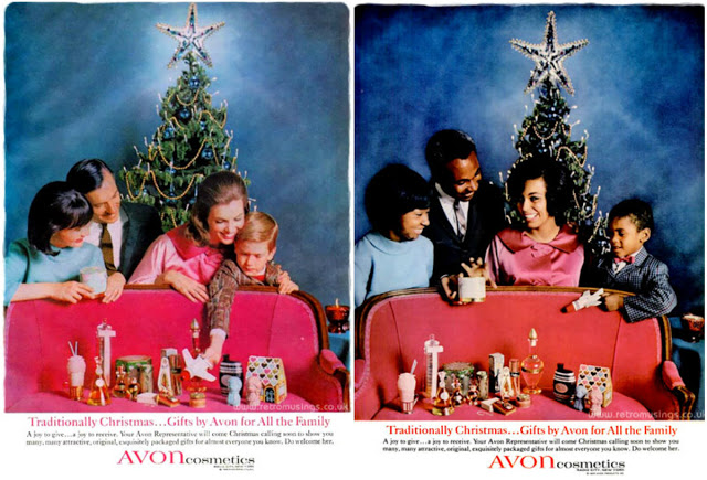These Christmas adverts for Avon cosmetics date from 1963-69. As was common for the time in America, photo shoots were taken using white models and black models separately using the same sets and similar poses.