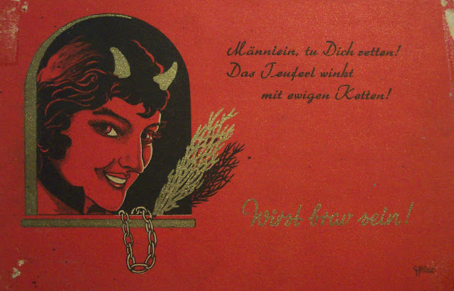 Most people know of the European Krampus who collected and punished bad children. There are quite a few German cards from early and mid-century that show a female version of Krampus who punishes bad men.
