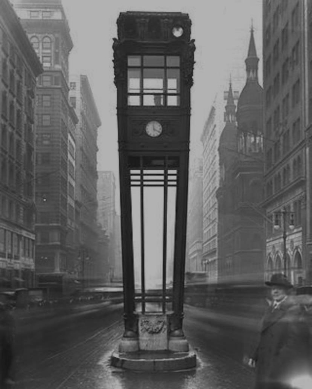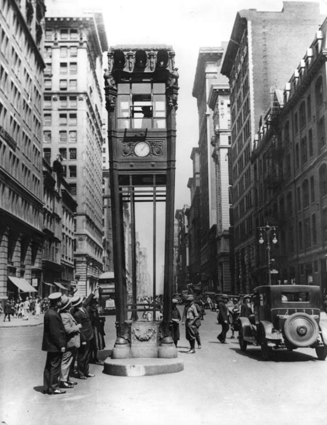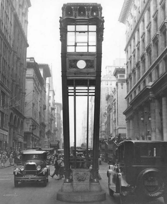 Dr. John A. Harriss, in charge of traffic, had originally introduced traffic towers along Fifth Avenue on February 16, 1920. Harriss paid for the traffic towers’ construction and maintenance out of his own pocket. These first traffic towers were sheds, housed twelve feet off the ground in the center of the intersections, manned by a traffic officer who controlled hand-operated green, yellow and red signals. The other traffic officers stationed along Fifth Avenue would take their cues from these signals in regards to the flow of traffic.