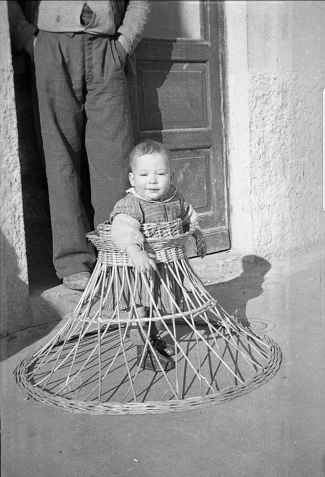 Go-cart was a common historical name for the wheeled version. Other alternatives were also used. A baby-runner was a padded wooden ring, set at the height of the baby’s waist, on a pole that was fixed into the floor and ceiling. The baby was placed inside the ring and able to move in a circle around the pole. This prevented the baby from reaching dangerous places, such as hot ovens.