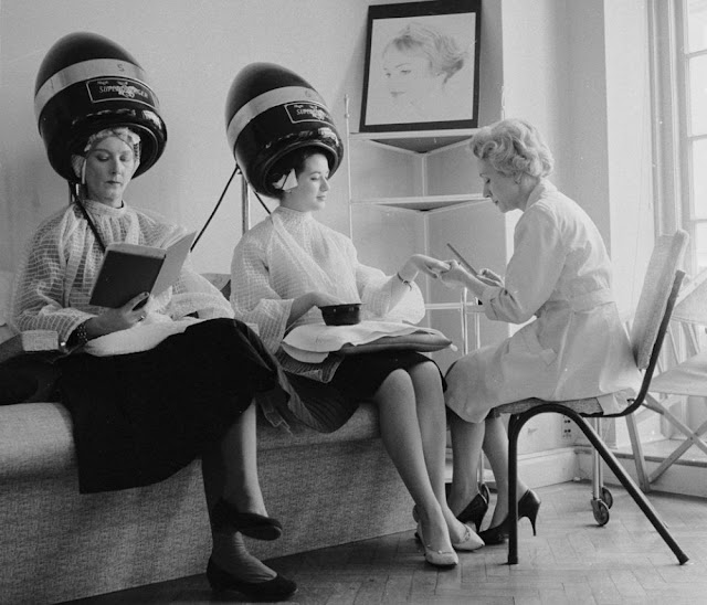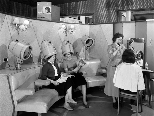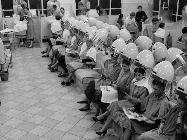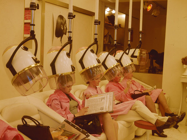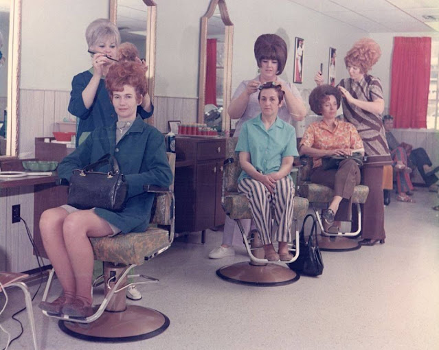 During the transition from the 1950s to the 1960s, big hair and bouffants were the hairdos of the day, but even as those hairstyles went out of fashion became more casual and easy to maintain women still frequented hair salons. Not only were salons the best place for someone to get their hair set for a big day, but they were the place to hear local gossip and just get away from the house for a little while. People popped in for “drive-bys,” otherwise known as just getting a quick touch up, and people were showing up to get their hair combed at least twice a week.