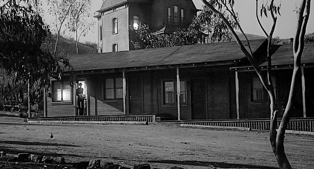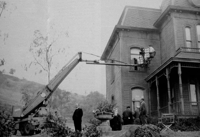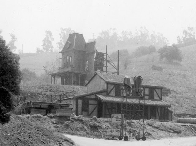 Alfred Hitchcock’s 1960 cinematic masterpiece Psycho, although originally distributed by Paramount, was financed by Hitchcock himself, and filmed at Universal Studios using the Revue Studios television crew from Alfred Hitchcock Presents. It was filmed on a tight budget, and accordingly, the exterior sets built for the film, the Bates Motel and home… were partly constructed from studio “stock units,” including in the case of the Bates home, a tower and front wall portion borrowed from an existing house set on the backlot’s Colonial Street. The Bates home, or “Psycho House” as it has come be known, was built as a two-walled exterior facade, as it would be filmed only from a vantage point within a 90 degree span.