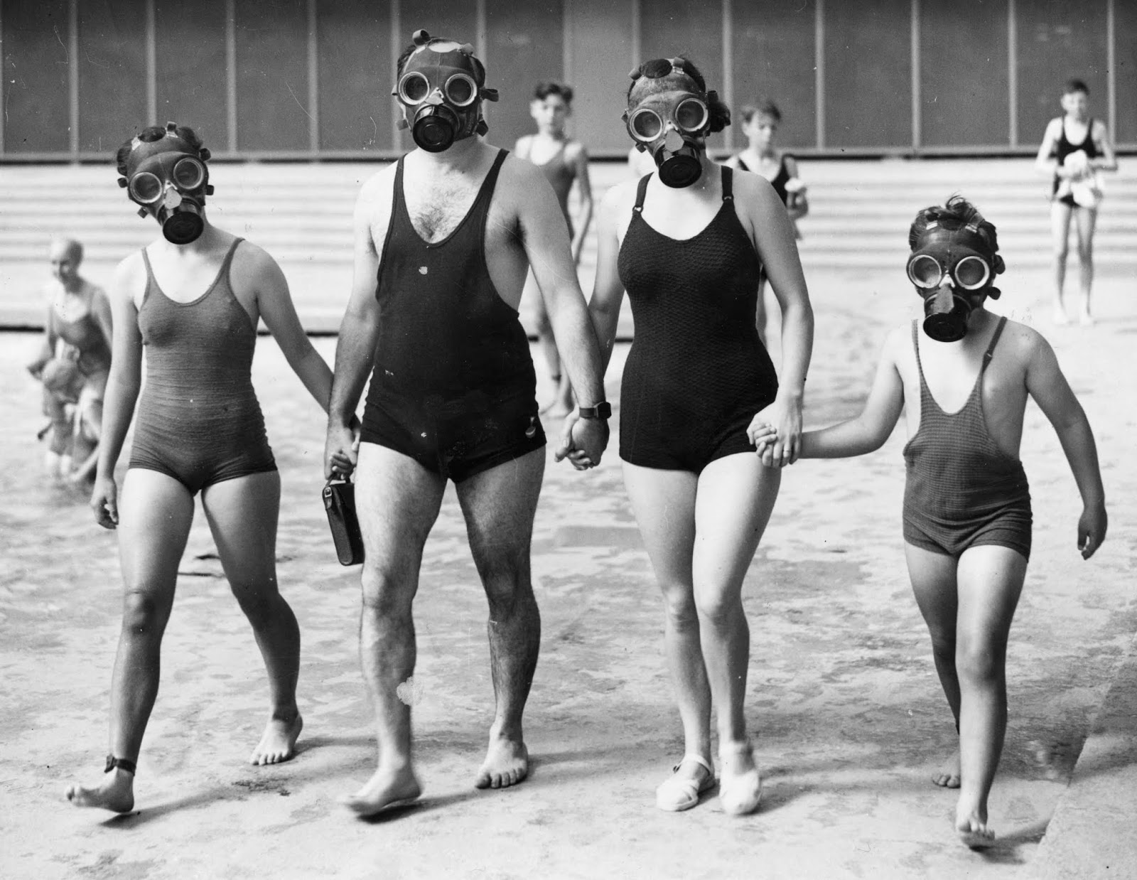 Just before World War II broke out, British residents were warned that the next conflict would include chemical warfare. In order to protect themselves from the effects of gas bombs, which could lead to respiratory diseases, people walked around in gas masks. This pre-war family is seen sporting gas masks while heading to the Empire Pool in Wembley, London.