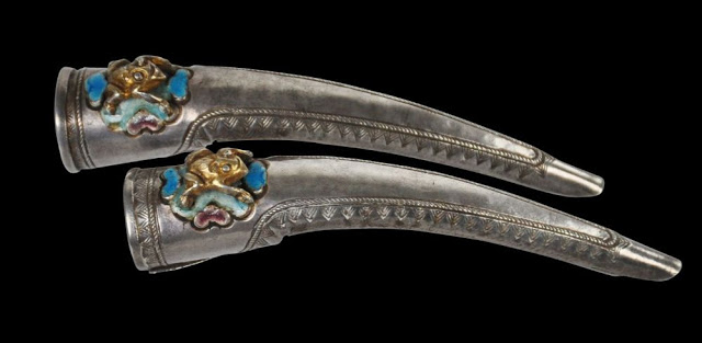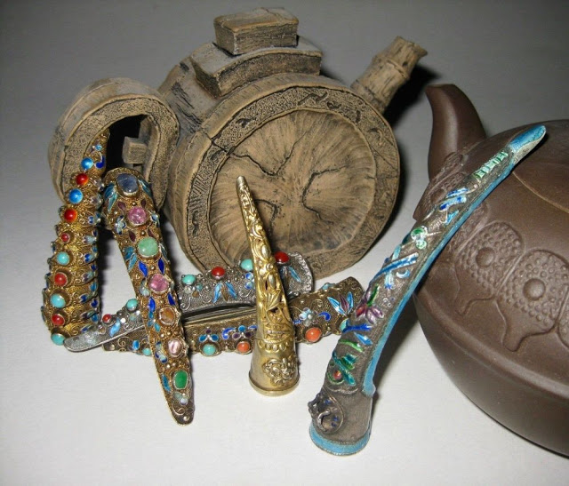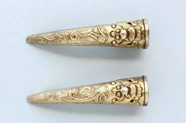 The Chinese fingernail guard came from the Ming dynasty but became popular in the Qing dynasty. For having long fingernails was a sign of power and beauty and wearing fingernail guards protected the nails.