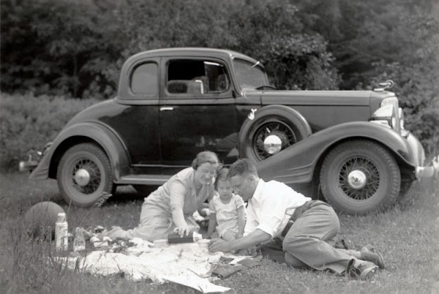 A family of three enjoying a picnic in the countryside. A 1933 Pontiac Eight Coupe can be seen in the background, 1935