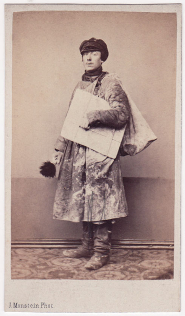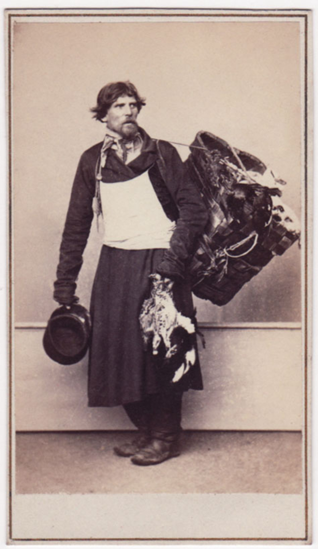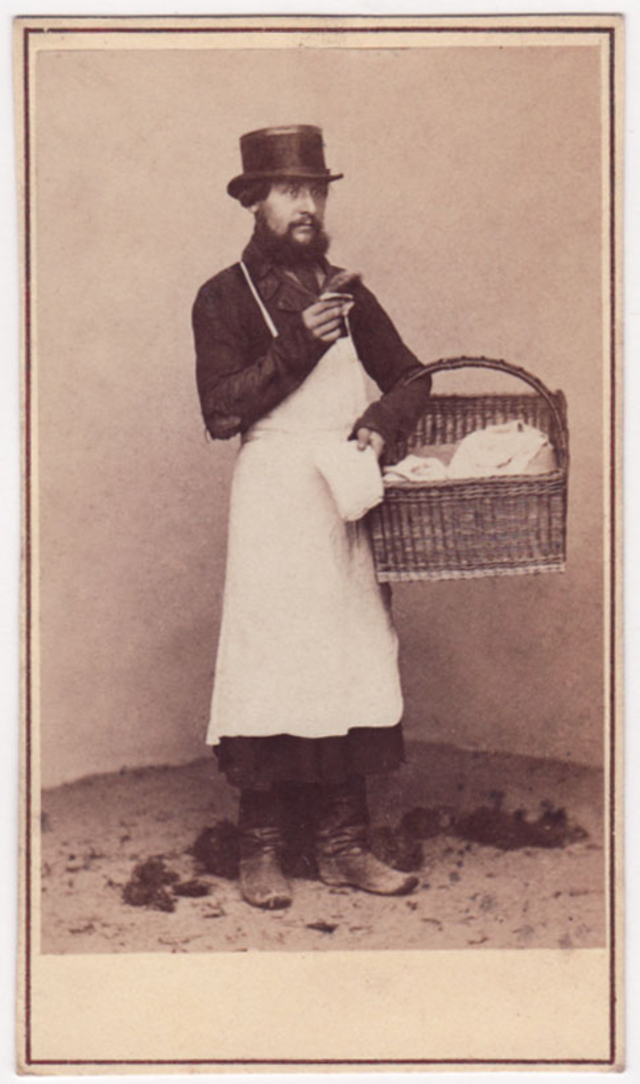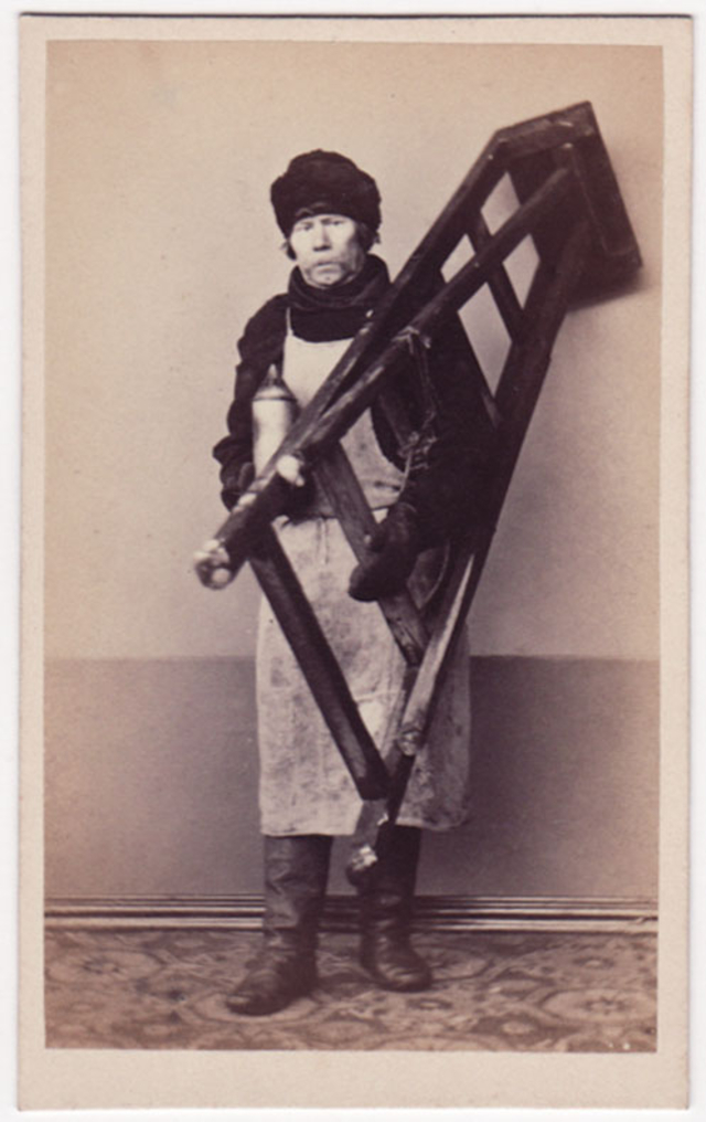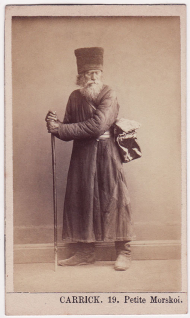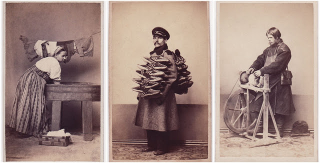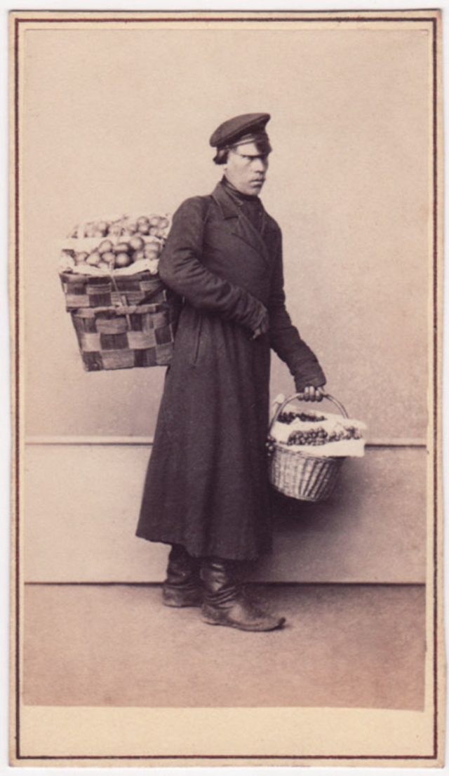 During the 1860s, several photographers based in Moscow and St. Petersburg produced series of cartes-de-visite showing Russian ‘types.’ These remarkable portraits provide a fascinating record of working-class townspeople, artisans, street vendors and peasants, some staged performing an activity and some photographed in the performance of their occupation.