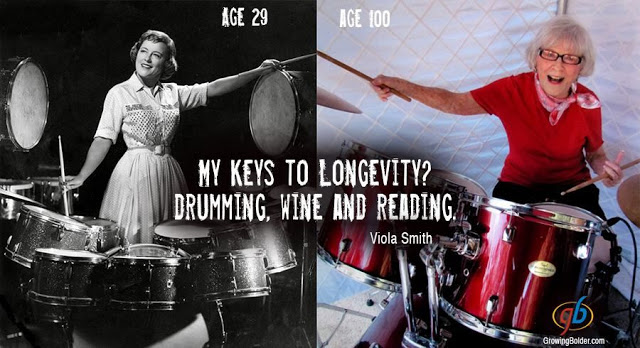 Several years ago she retired from teaching drums, but to this day she still performs. Explaining her longevity, she said: “I definitely think that the exercise involved in drumming contributes to longevity. Spending two summers in Europe in 1942 and ‘44 started the wine habit: two glasses with dinner. Also hearing about a wine drinking community in Southern France where the longevity far exceeds that of the country as a whole. Thirdly, reading all of Adele Davis’ books over several decades ago, on a recipe for a long life.”