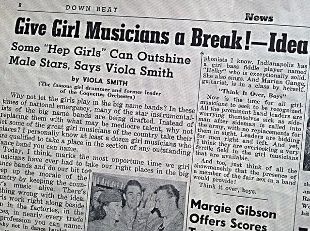 During the midst of WWII in 1942, she published an article in Down Beat magazine titled “Give Girl Musicians A Break!” Smith says, “I was asked to write the article on behalf of the many capable girl musicians who were out of work.” In it, she wrote, “In these times of national emergency, many of the star instrumentalists of the big name bands are being drafted. Instead of replacing them with what may be mediocre talent, why not let some of the great girl musicians of the country take their place?” The article generated furious discussion about the prejudice against female musicians.
