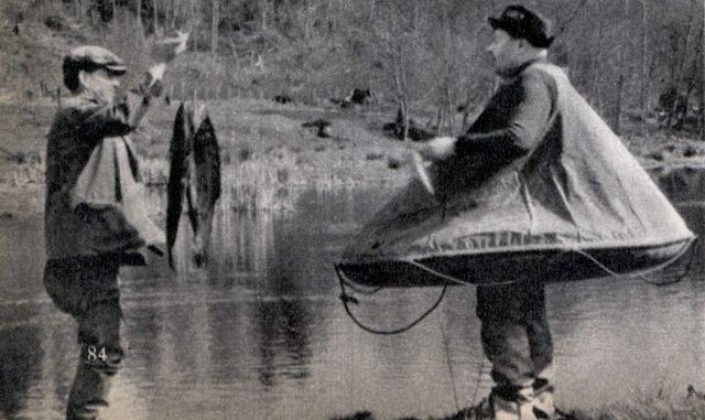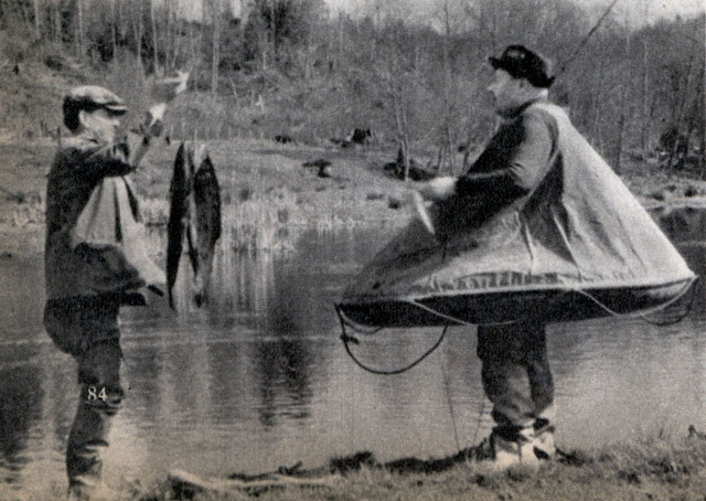 In 1938, a developed wading suit enables a fisherman not only to wade into a stream, but to float from spot to spot as well. The suit consists of a circular air-filled chamber, rubber wading boots and a water-proof body coverall comprising an integral, leak-proof unit, as shown in the photograph below.