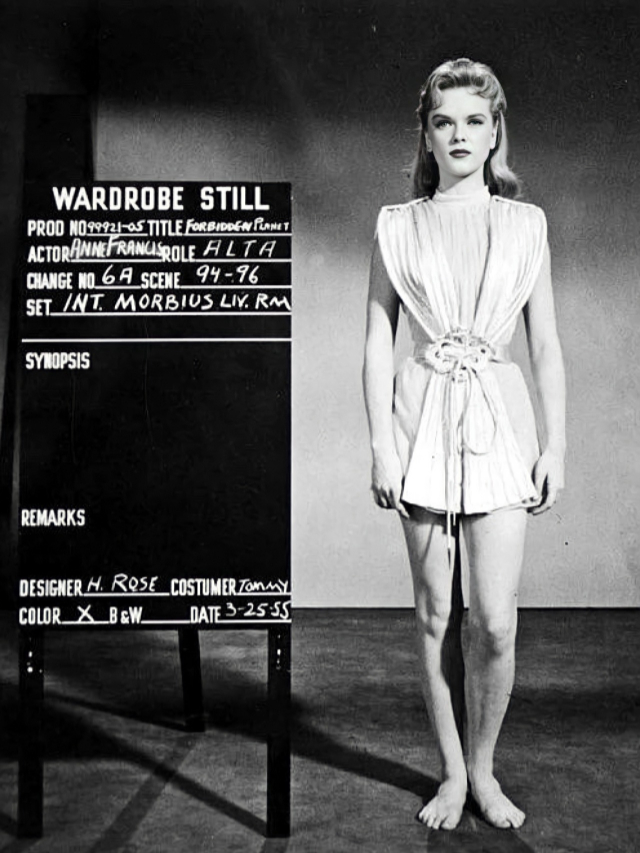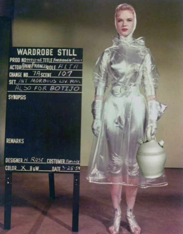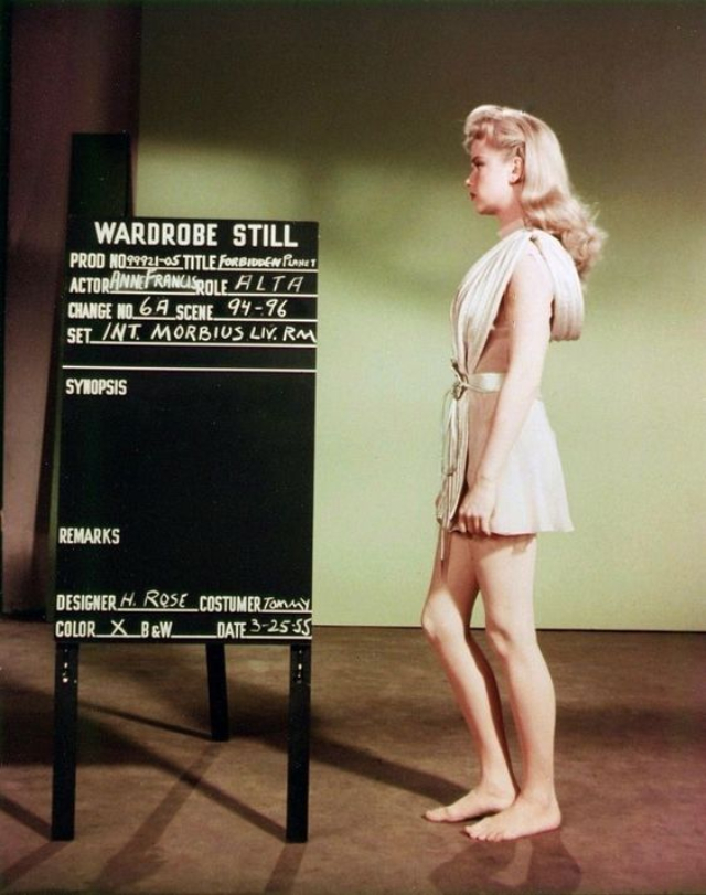 The costumes worn by Anne Francis were designed by Helen Rose. Her miniskirts resulted in Forbidden Planet being banned in Spain; it was not shown there until 1967. Other costumes were designed by Walter Plunkett.