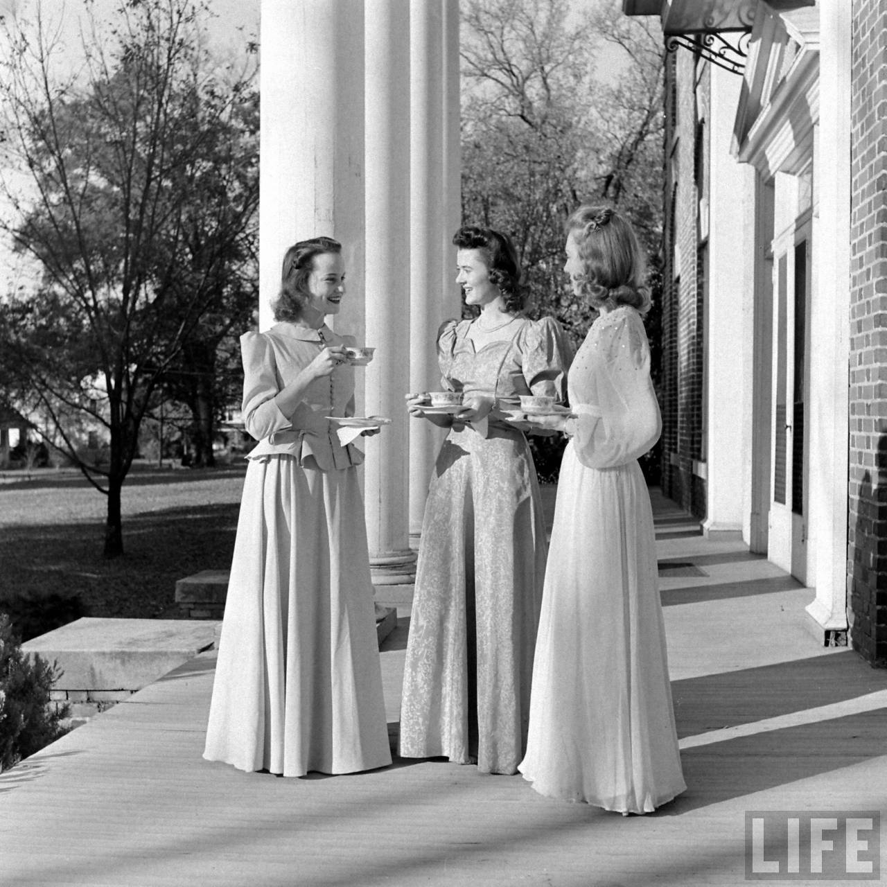 Here, some candid photographs by Alfred Eisenstaedt taken at Judson College in Marion, Alabama in the 1950s. They show typical women’s college activities–sketching architecture in the leaves, reading in the cemetery, tomb lounging, reading in groups of three and holding hands in black robes.