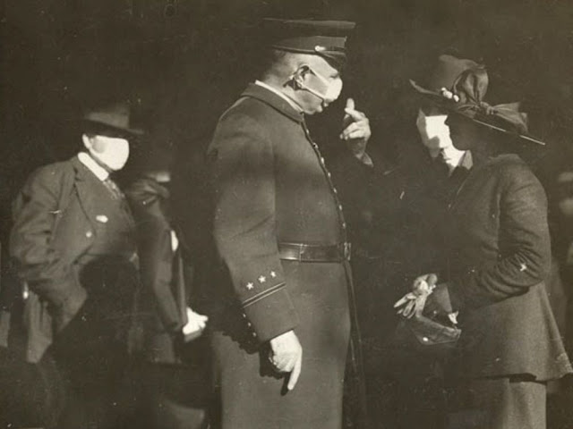 | A policeman gives a woman a warning for not wearing a mask during the Spanish flu pandemic in San Francisco in 1918. (California State Library) |