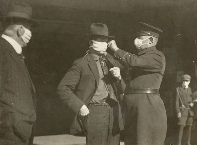 | A policeman adjusts a citizen’s flu mask in San Francisco in 1918. (California State Library) |