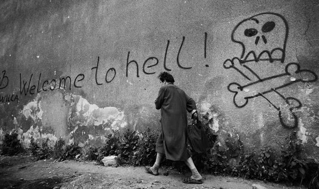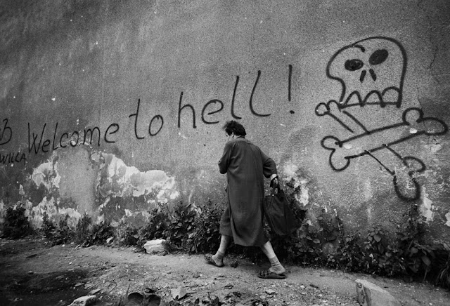 At the entrance to the city is a wall inscribed with graffiti: “Welcome to hell.”