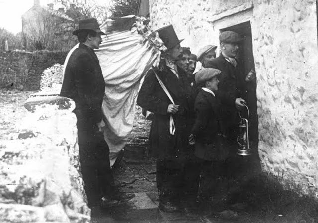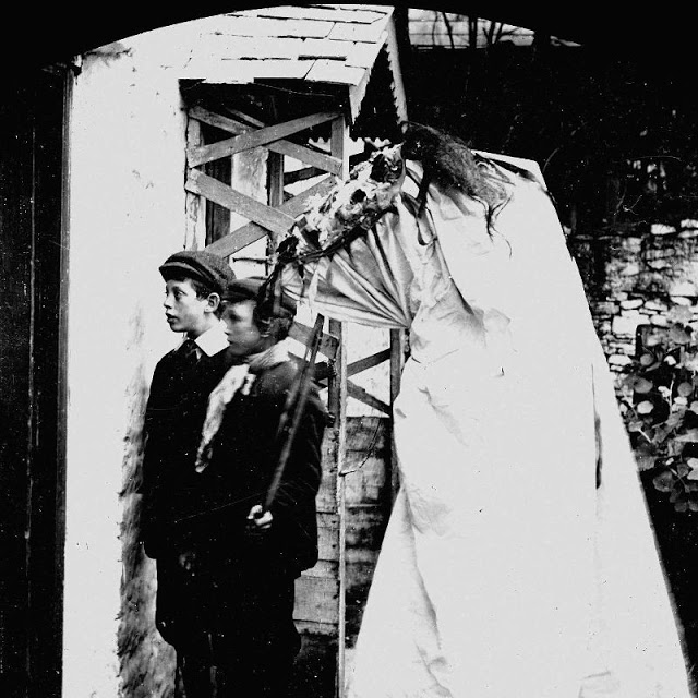 The Mari Lwyd or, in Welsh, Y Fari Lwyd, is a New Year custom once prevalent in the valleys of South Wales. Translated, the name means ‘the Grey (or Holy) Mary’ although this is likely a more recent rendering of ‘the Grey Mare’, as the tradition surrounding the Mari Lwyd involves the parading of a horse’s skull.