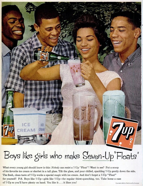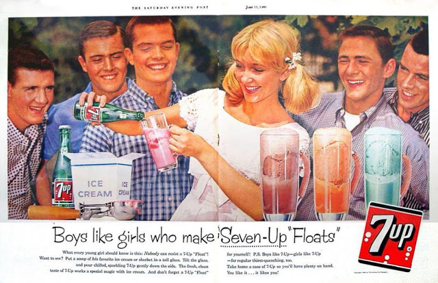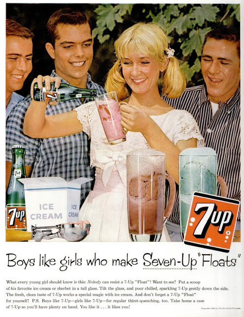 Boys like girls who make Seven-Up “Floats”What every young girl should know is this: Nobody can resist a 7-Up “Float”! Want to see? Put a scoop of his favorite ice cream of sherbet in a tall glass. Tilt the glass, and pour chilled, sparking 7-Up gently down the side. The fresh, clean taste of 7-Up works a special magic with ice cream. And don’t forget a 7-Up “Float” for yourself! P.S. Boys like 7-Up — girls like 7-Up — for regular thirst-quenching, too. Take home a case of 7-Up so you’ll have plenty on hand. You like…it likes you!