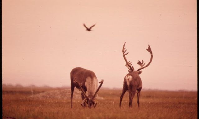 Caribou Feed on Lichens and Moss. The Bird Is an Alaskan Raven, August 1973