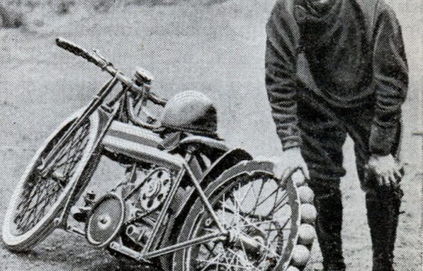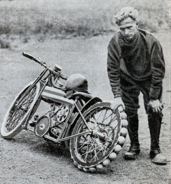 In 1932, Les Blakeborough, the well known English dirt track motorcycle rider, has invented an entirely new back wheel for his racing machine, which consists of a series of large wooden balls mounted on the rim in place of the conventional pneumatic tire.